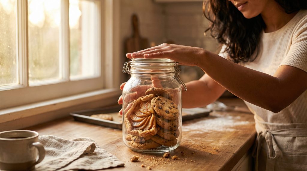 Para manter a textura, o inimigo número um é a umidade do ar. Biscoitos crocantes devem ser armazenados em potes herméticos de vidro ou plástico, mas apenas depois de completamente frios. Se guardados mornos, o vapor criará umidade interna.
