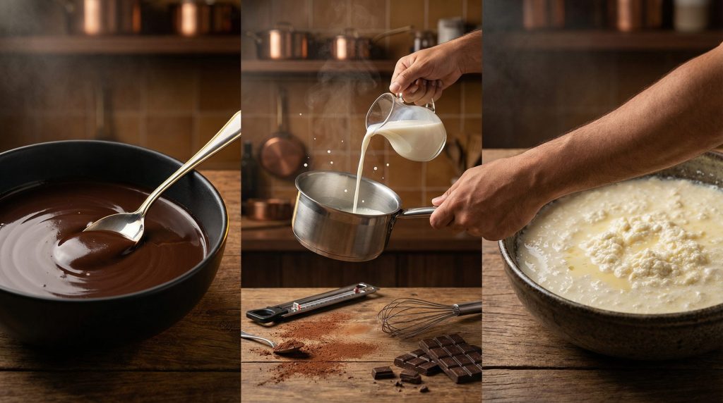 Para obter uma ganache lisa e brilhante, a regra de ouro é verter o creme de leite quente sobre o chocolate picado e aguardar alguns minutos antes de mexer. A fricção deve começar do centro para as bordas, criando um núcleo elástico e brilhante. Se a mistura talhar, muitas vezes uma colher de sopa de líquido frio (leite ou água) e um mixer de mão podem recuperar a emulsão. A proporção muda conforme o uso: