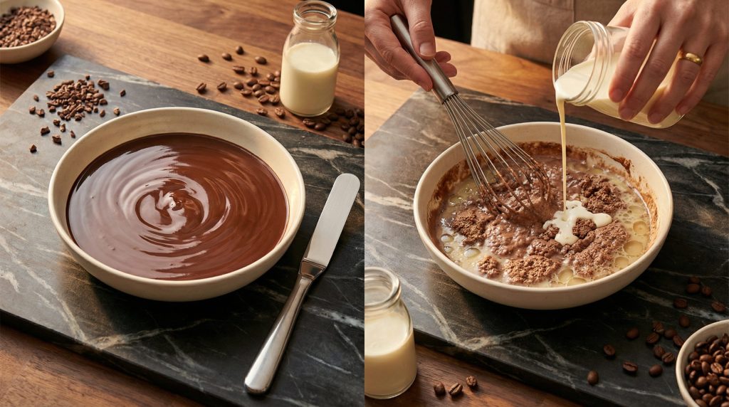 Os cremes de chocolate para pavês e sobremesas de taça geralmente partem de uma base de amido de milho (maisena). Diferente das ganaches e dos ovos, o amido precisa ser cozido corretamente para perder o gosto residual de farinha. A técnica correta envolve: