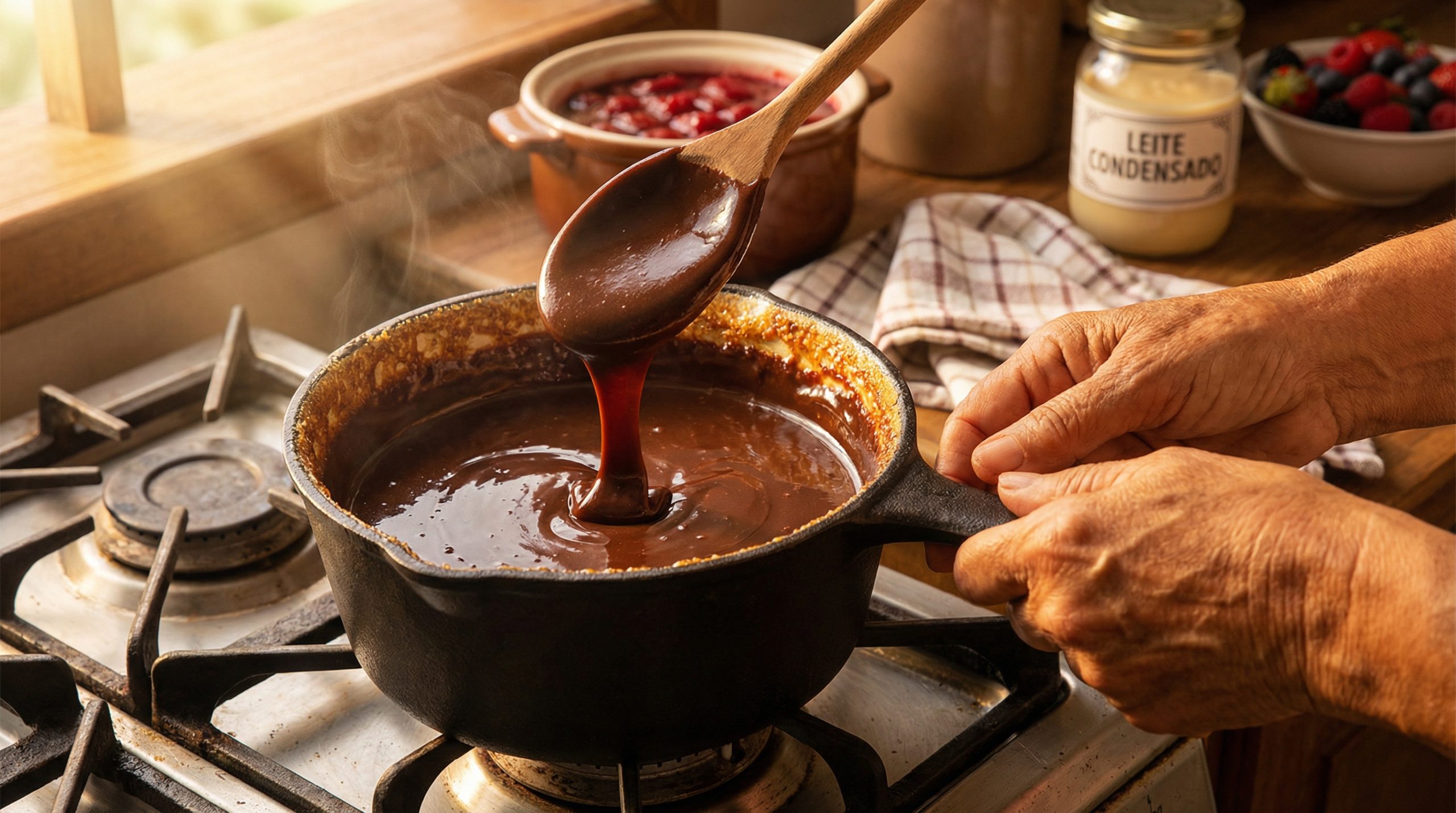 Para doces à base de leite condensado, a regra visual mais famosa é o “Caminho de Moisés”. Ao passar a espátula no meio da panela, o doce deve se separar e demorar a voltar a se unir, revelando o fundo da panela nitidamente. Se o líquido retorna rapidamente, ainda está em ponto de colher (cremoso). Se ele mantém a separação e forma blocos ao cair da espátula, está no ponto de enrolar. É interessante notar que, ao contrário de sobremesas internacionais complexas, como a descrita pela BBC sobre a ćetenija bósnia, que requer várias mãos para ser preparada, o doce de panela brasileiro é uma arte solitária e direta, dependendo apenas da observação do cozinheiro.