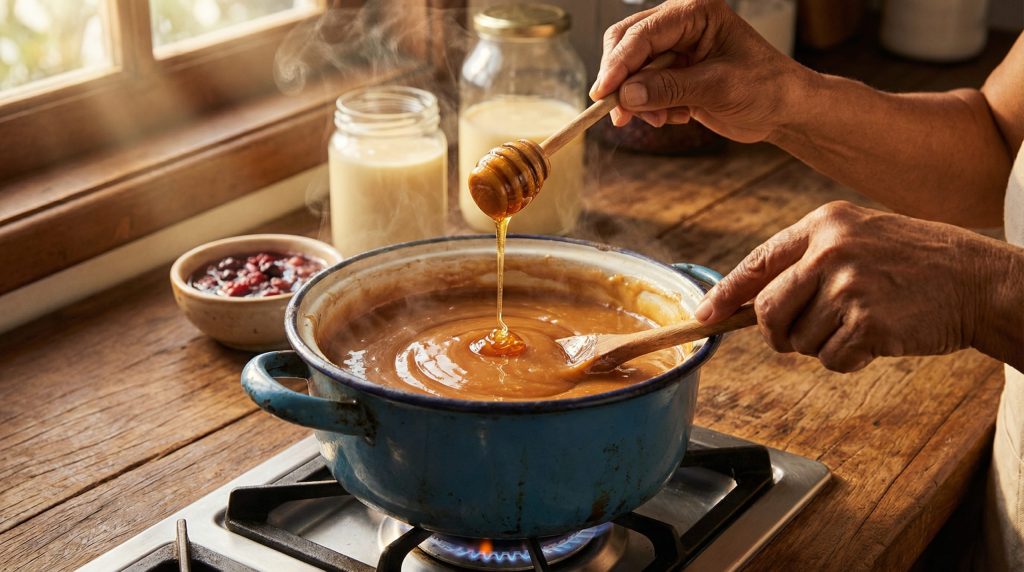 Embora os ingredientes sejam básicos, o preparo não pode ser negligenciado. O arroz doce, por exemplo, deve ser cozido lentamente para que o grão libere o amido e crie cremosidade sem precisar de aditivos. É um contraste interessante com outras culturas culinárias. Por exemplo, segundo a BBC, sobremesas tradicionais bósnias como a *ćetenija* requerem “vários pares de mãos” e um esforço físico coletivo para serem preparadas. No Brasil, nossos doces de panela, embora muitas vezes exijam braço forte para mexer, são frequentemente um ato solitário de amor e paciência ao fogão.
