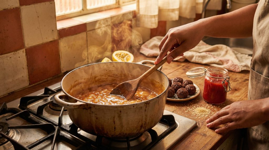 - Fogo Adequado: O fogo muito alto evapora o líquido rápido demais, concentrando o açúcar antes do tempo. Paciência com o fogo médio-baixo é fundamental.