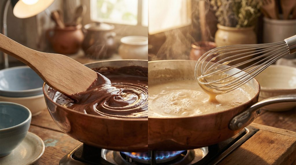 A maior dúvida de quem prepara esses doces é saber a hora exata de desligar o fogo. Para doces de colher ou de copinho, o ideal é retirar a panela do calor assim que o creme começar a ganhar consistência, mas ainda cair em fita da espátula. Já o famoso ponto de enrolar (ou ponto de estrada) ocorre quando, ao passar a espátula no meio da panela, o doce se separa e permite ver o fundo por alguns segundos antes de se unir novamente. Estudos sobre o impacto dos doces no paladar mostram que a textura influencia diretamente a percepção de prazer; inclusive, segundo a BBC, sobremesas cremosas têm um efeito específico em como o cérebro processa a saciedade e a recompensa, o que explica nossa preferência por texturas aveludadas.