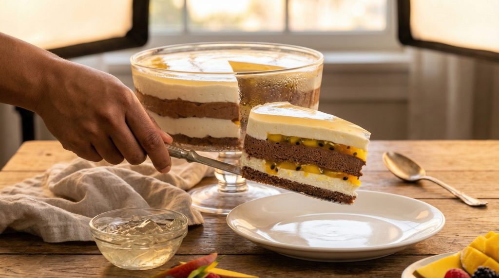 A apresentação é metade da experiência gastronômica, e as sobremesas geladas se beneficiam enormemente da montagem em recipientes transparentes. Seja em uma taça grande para compartilhar (estilo trifle) ou em porções individuais, a visualização das camadas cria uma antecipação do sabor. A arquitetura do doce deve ser pensada para que, a cada colherada, o consumidor experimente todas as texturas: o crocante, o cremoso e o úmido.