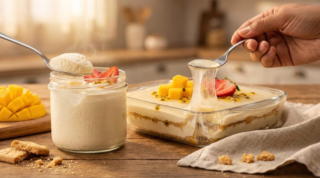 A mousse, originalmente uma receita francesa à base de claras em neve e chocolate, ganhou adaptações tropicais no Brasil. A versão mais popular, feita no liquidificador com leite condensado, creme de leite e suco concentrado de fruta (como maracujá ou limão), é imbatível em praticidade. Para quem busca uma textura mais “profissional” sem usar ovos crus, a utilização de chantilly batido incorporado delicadamente ao creme base garante aquela aeração sofisticada, cheia de furinhos, que caracteriza uma boa mousse.